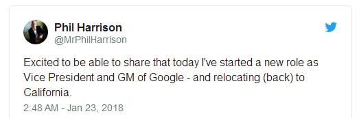 近日,前微软和索尼PlayStation总裁菲尔·哈里森在其个人社交账号推特上公布他已经加入谷歌,担任副总裁和总经理的职位,他现在已经上任一个小时了。他没有透露加盟谷歌的目标,和决定加盟谷歌的原因,不过预计可能和电子游戏有关。