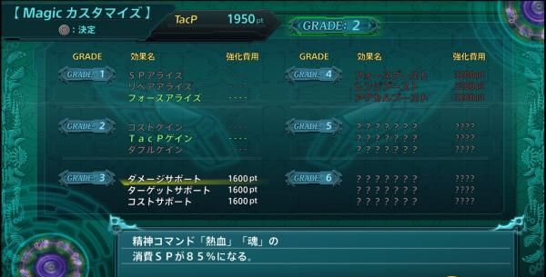 本作的特殊技能采用了技能树系统,玩家可以使用战斗中获得的《TacP》点数来开发新的特殊技能!技能方案是可以让每一个机师修得新技能的系统,尽管会有重复,每一位机师都可以最多修得30个技能。工厂系统是老玩家熟悉的Magic的效果定制系统(3选一)。