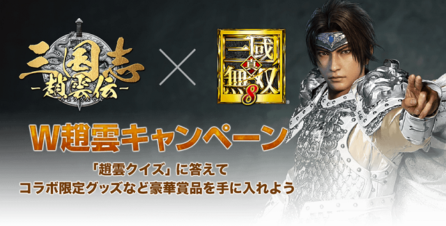 此外,《真‧ 三国无双8》将在日本与正在发售的DVD电视剧《三国志 赵云传》展开联动,在2月8日-2月16日期间官方将会推出答题活动,成功回答问题将有机会获得《真‧ 三国无双8》PS4游戏、《三国志 赵云传》DVD套装、特制文件夹和徽章。《三国志 赵云传》是大陆剧《武神赵子龙》在日本发行的版本,由林更新、林允儿主演。