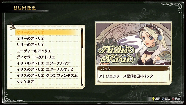 本次发布的历代背景音乐DLC共包含140首乐曲,收录了“玛莉的炼金工房”“艾莉的炼金工房”“莉莉的炼金工房”等系列初期作品的乐曲,同时也包括初代重制版。玩家可在游戏中切换背景音乐,“工作室”“王都”“草原”“普通战斗”等情景的背景音乐都可以进行个性化设置。