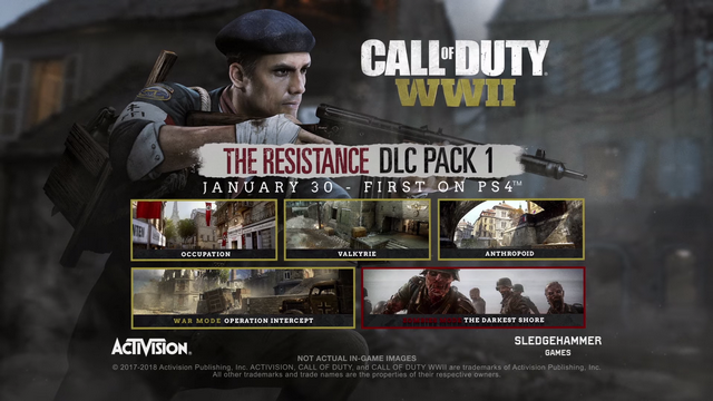 “抵抗”于今年1月30日首先登陆了PS4平台,其中包含一张全新战争模式地图“拦截行动(Operation Intercept)”、三张以史上著名的起义为背景的标志性多人地图:位于斯洛伐克的“类人猿(Anthropoid)、重制的系列经典地图“占领(Occupation)”、以希特勒指挥部为原型的“女武神(Valkyrie)”,以及纳粹僵尸的最新章节“漆黑海岸(The Darkest Shore)”。