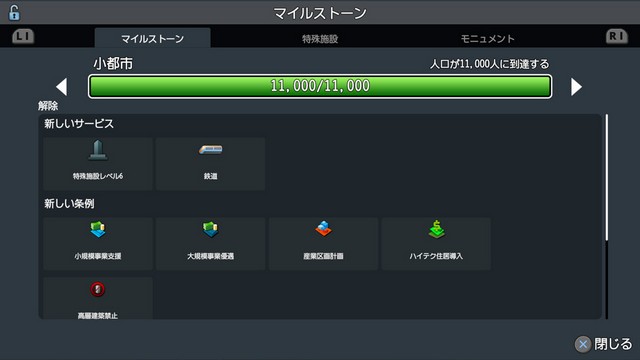 游戏中包含阶段性目标,如城市总人口数等项目。如果达成目标即可建造新的设施,逐步扩大城市的规模。同时游戏中也设置了多种多样的城市目标,完成后可以开放“纪念建筑”和“特殊设施”,用以提高城市的发展速度,增设更加华丽的景观。