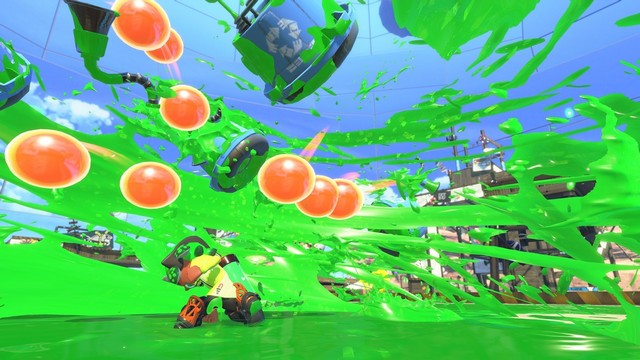 在这个五彩缤纷、乐趣多多的世界里,游戏的人物和场地在Switch上的表现如何呢?武器商谢尔登(Sheldon)和服装商Jelfonzo的细节和纹理丰富了不少,每个地图里都有各种各样的街道艺术和涂鸦,颜料颜色鲜明。除此之外,《喷射战士2》在八人游戏中能稳定在60帧,画面很流畅。掌机模式和TV模式之间进行切换时,调整一下灵敏度的选项,对游戏体验非常有帮助。