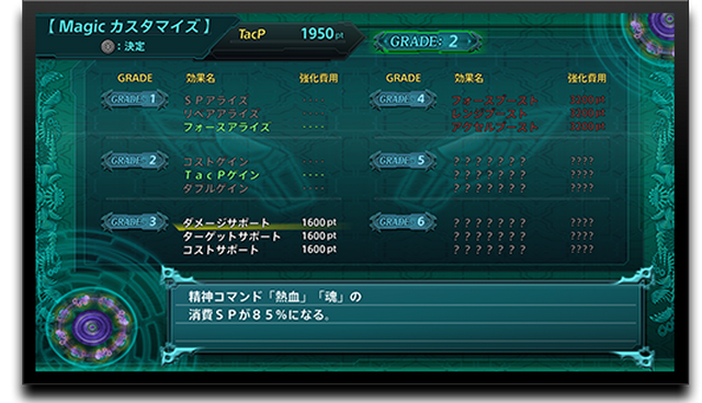 “Magic定制”包含0~6个级别的“GRADE”,“GRADE:0(初期状态)”没有任何效果,“GRADE:1”开始生效。此外,玩家可以选择三种GRADE效果中的一个,且选择后将不可更改。