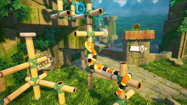 控制一条蛇移动听上去可能很困难,但是实际操作只需要三个键就可以做出爬行、攀爬竹架和缠绕横杆等复杂的动作。这条蛇有个可爱的名字,叫做面条(Noodle),你可以用一个键控制前行,而另外一个键则用来抬起蛇头。通过倾斜模拟摇杆,你可以控制蛇头的角度,这样你就可以对物体进行缠绕了。蛇的攀爬才是游戏中做得最出色的地方,你缠绕的圈数越多,越容易往上爬。