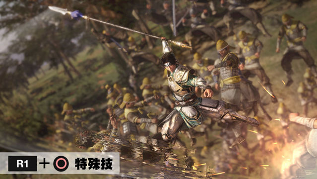 运用简单操作就能完整体验一骑当千爽快感的操作方式依然保留,视倒地不起与晕眩等敌人状态、敌人的距离等,能适时适地视状况使出各种动作的崭新系统。在玩家创造有利局面的状况下,适时搭配各种动作,体验自由自在的战斗。