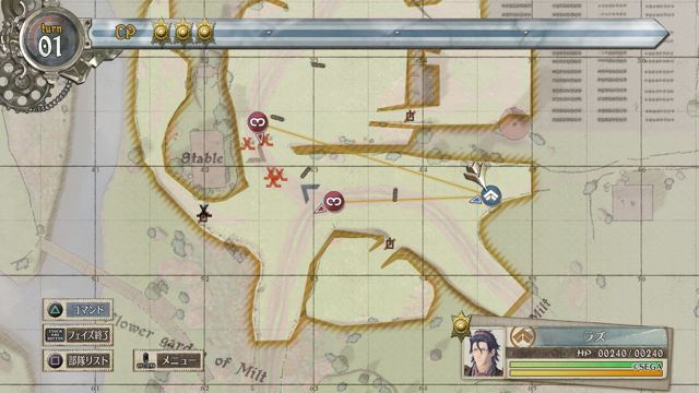在战斗当中,如何管理「AP」(动作点数)也是很重要的一环,AP 可以说是用来表现角色可以移动的范围,只要移动就会减少,消秏归零后自然就无法再次移动。要注意如果停在敌人射程范围之内,就算是在我军回合当中也会遭受迎击。最好是可以摆好阵形,对正准备要进军的敌人给予迎头痛击,这部份就是战略模拟角色扮演游戏必须要玩家动脑的要素了。