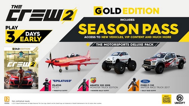预购《飙酷车神2》黄金版将获得提前3天(即6月26日)进入游戏的特权,黄金版包含: 游戏季票、传奇动力包、赛车运动豪华包,玩家即刻就能开始收集《飙酷车神2》中的众多座驾。通过“飙酷车神奖励计划”,玩家只需完成《飙酷车神》中一系列的月度挑战即可在新作《飙酷车神2》中解锁最多19种不同座驾,其中还包含独家空中及水上载具。