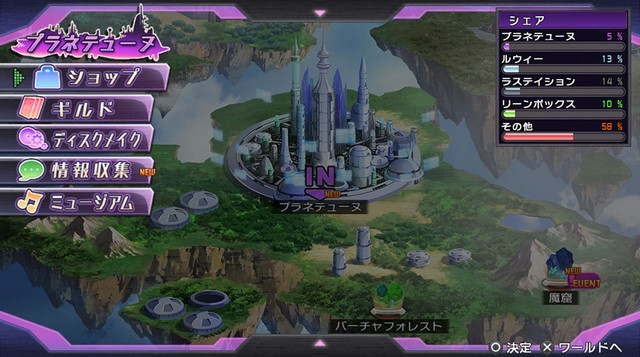 本作的背景设定在被称为“游戏业界”的奇妙世界里,这个世界共分为プラネテューヌ、ラステイション、ルウィー、リーンボックス四个国家,每个国家都存在可以接受任务的行会。同时居住在当地的人们可以为玩家提供各种各样的信息,一定要多多利用。