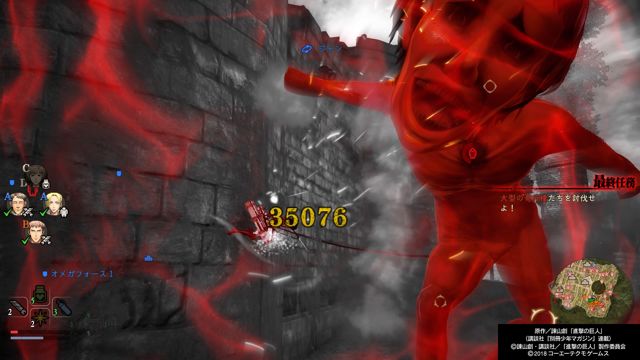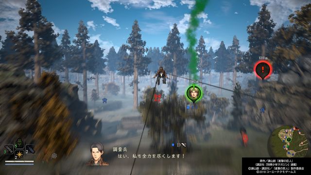 虽然巨人变得更加棘手,但是人类也有「奇袭攻击」、「钩驱动」以及「队友行动」等全新系统登场,让玩家在作战时更有发挥技巧的空间。奇袭攻击是在没被巨人发现的状态下,才可以施展出的攻击。按下【R2】拿出望远镜,让巨人保持在视线范围之内,等计量表提升到最大上限时再按下【△】靠近,并在时机正好时再一次按下【△】钮的话,就可以直接对后颈发动攻击。在主角的技能当中,也有更不容易被巨人发现的「匿踪(ステルス)」,以及使用望远镜瞄准目标后马上就能开始冲刺的「电光火石」等技能,组合重视奇袭的技能似乎也别有一番乐趣。