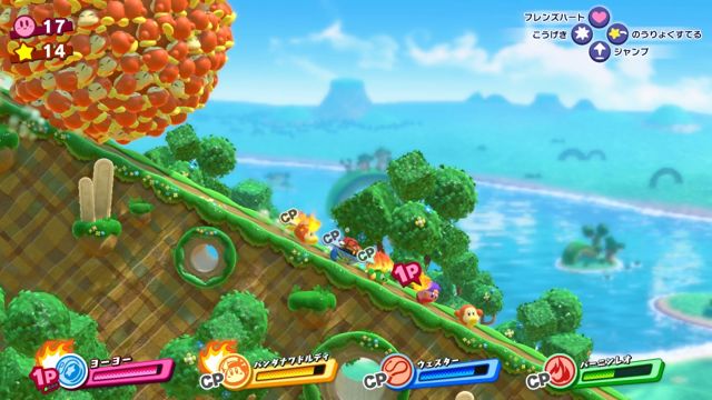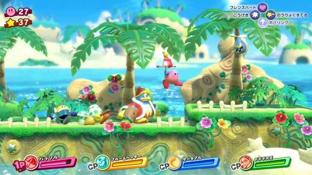 本作是一款横向卷轴动作游戏,除了有「吸入、吞食、复制」这个系列作已经是惯例的动作以外,还追加了后面会提到的全新要素「好友之心(フレンズハート)」。要使用各个角色特有动作来并肩作战,除了单人游戏外,还可以享受到最多四名玩家的多人合作。