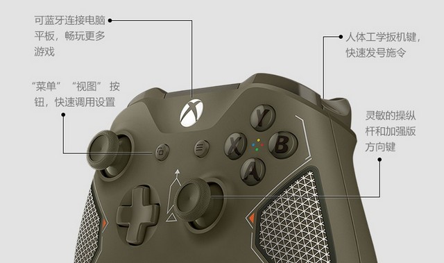 “突击奇兵”手柄采用了军绿色涂装,搭配了黑、银、橘三色点缀的面板设计。同时手柄背面配置了菱形的橡胶防滑握把。“突击奇兵”可与7支手柄同时连接一台设备,并且支持连接Windows 10的蓝牙功能,兼容游戏主机Xbox One、Xbox One S与Xbox One X。