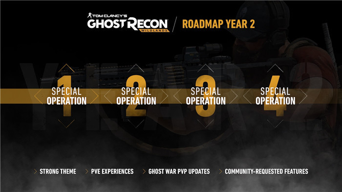 《幽灵行动:荒野》第二年度会带来四次名为“特殊行动”的免费主题更新,每一次更新都有着独特的主题,包括有着特别挑战和独特奖励的PVE战役免费特殊任务,Ghost War 4V4 PVP模式的更新,以及其他在玩家社区中呼声较高的的功能。