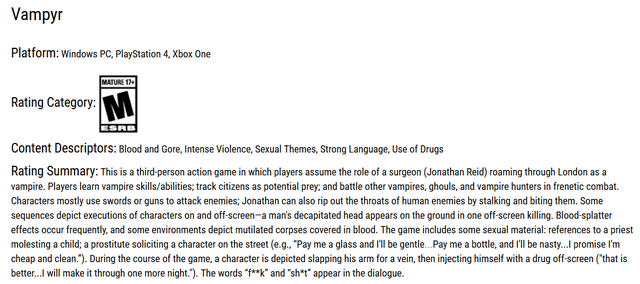 最近,由《奇异人生(Life Is Strange)》开发商Dontnod Entertainment工作室打造的第三人称动作冒险游戏《吸血鬼(Vampyr)》已有评级机构ESRB完成了评级。本作因为有许多血腥暴力等少儿不宜的内容而被评为M级。