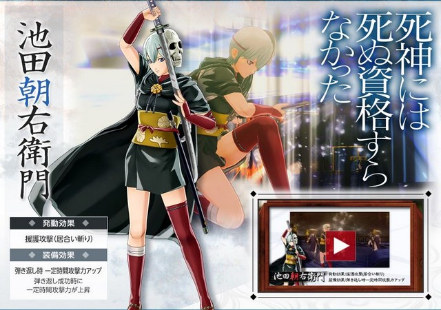 下次将要放出的角色视频为“池田夜右卫门”,他比朝右卫门更为强力,是一名悲情角色。