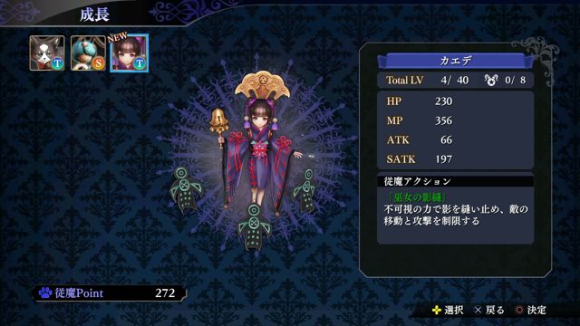 而且加入成为伙伴的邪妖,也就是「従魔(セルヴァン)」的等级,也一样要在维修室里提升。在提升从魔等级时,要使用透过任务报酬等管道取得的「从魔点数」,把点数分配到从魔的各种能力上使从魔成长。成长到等级上限的从魔,可以进行转生,在这时等级虽然会回到初期值,但是能够成长的上限会有所提升。