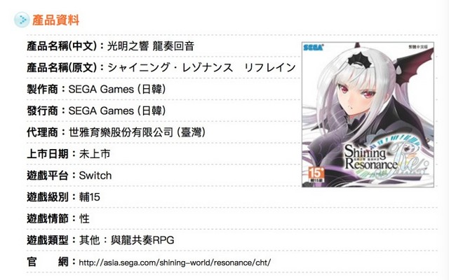 世嘉游戏《光明之响 龙奏回音(Shining Resonance Refrain)》近日出现在了台湾游戏评级机构名单中,在图片中我们可以看到语言信息部分标明本作对应繁体中文。本作的PS4版本在首发时就已经对应中文。