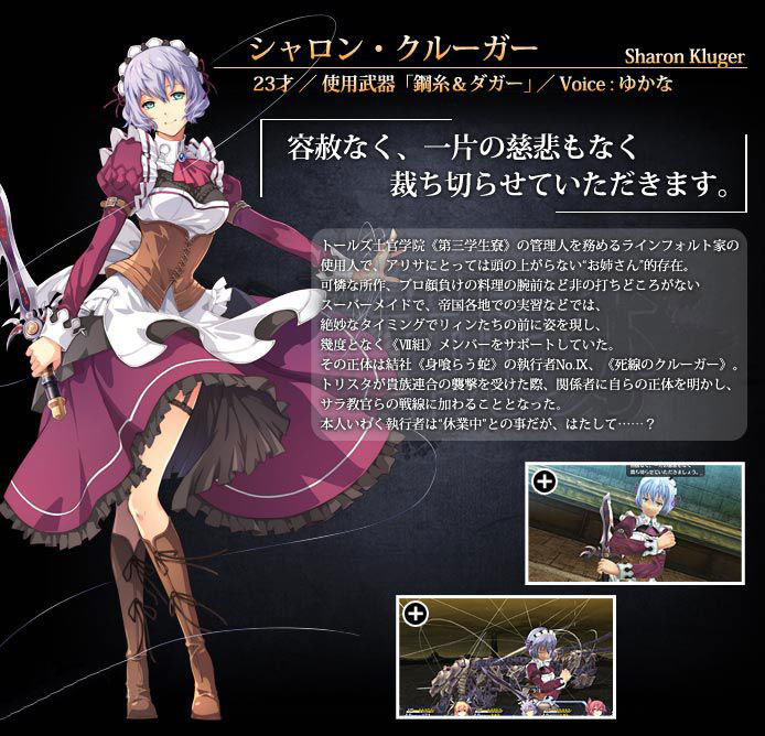 23岁。亚莉莎的母亲聘请的专职女仆,于前作被派往服侍第三学生宿舍,因其在前作神出鬼没地出现并帮助“Ⅶ班”的人,被“Ⅶ班”的人称为“超级女仆”。其真实身份是神秘组织“噬身之蛇”所属的执行者No.Ⅸ「死线·克鲁格」。曾参与过两年前袭击帝国游击士协会的行动,使身为S级的游击士的卡西乌斯去往帝国并进行牵制,为完成福音计划进行了帮助,但不知因何暂时退出。在前作为帮助因内乱而被攻击的军官学校黎恩一行人,最后下落不明。