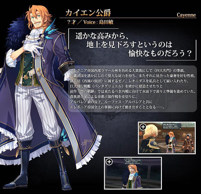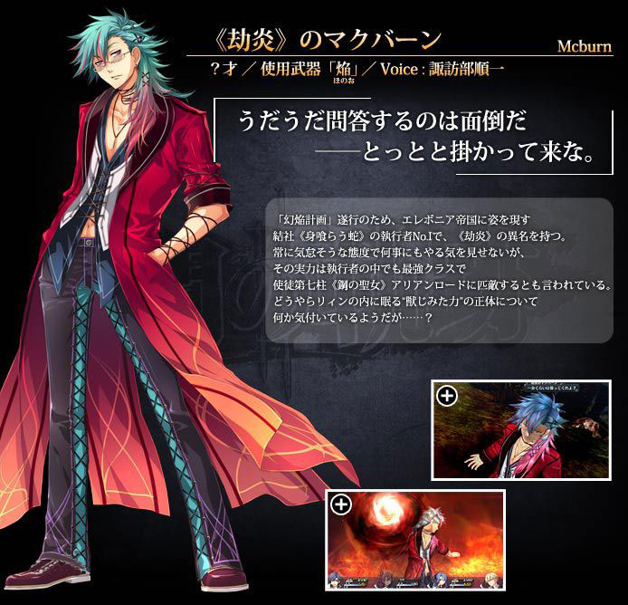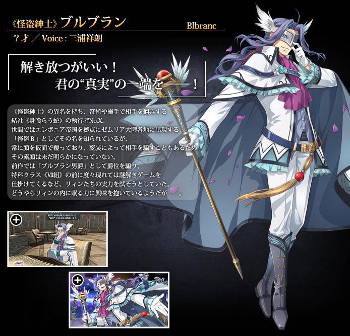 用魔术和戏法摆弄对手的结社“噬身之蛇”执行者No.X「怪盗绅士」。以基于埃雷波尼亚帝国为据点在塞姆利亚大陆各地出现的“怪盗B”而闻名,平时一直戴着面具,同时为了方便变装欺骗对手,真实相貌一直没有揭露。前作以“布卢布兰男爵”这一假冒爵位多次在“Ⅶ班”面前设置解谜游戏,测试了一众的实力。似乎对黎恩体内寄宿的力量很感兴趣……