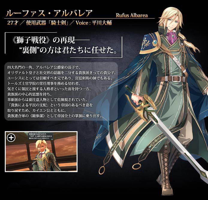 27岁。艾尔巴雷亚公爵家的长子,与奥利维特皇子是在社交界一时瑜亮的贵公子。尤西斯十分信赖的兄长,执掌宫廷剑术教鞭,同时担任托尔兹军官学院常任理事的逸才,在秉承亲民人格的外表下,存在着贵族派的思想中心,被革新派视为重要人物而时刻防备着。为取回“由贵族支配平民”这一帝国应有的传统,与凯恩公爵合作,担任贵族联盟军“总参谋”控制了帝国全境。