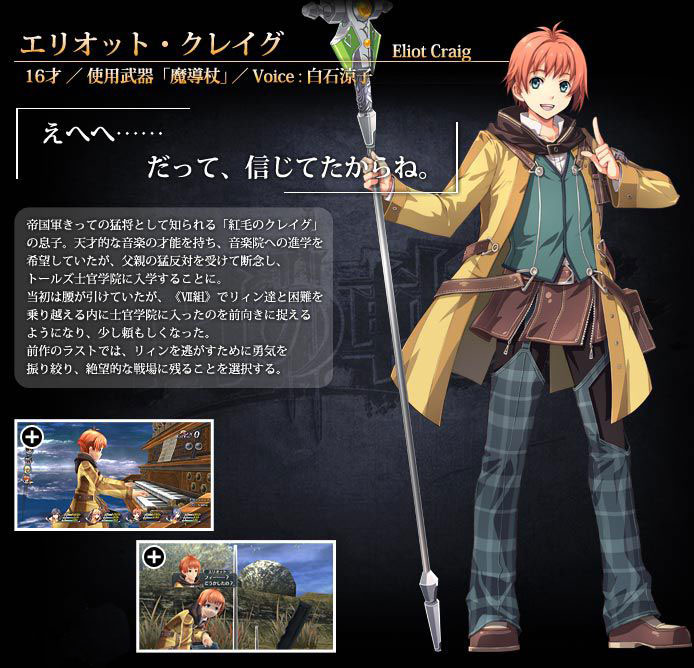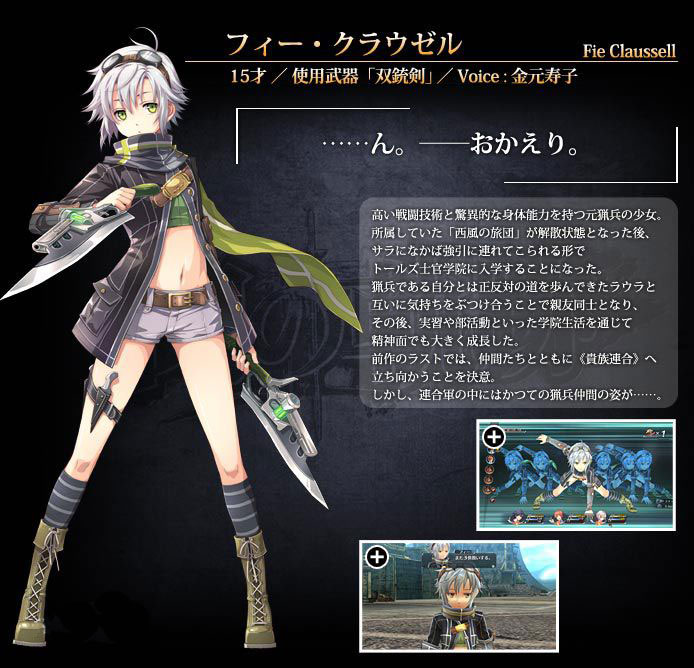 15岁。拥有高超战斗技术与令人惊异的身体能力,猎兵组织“西风旅团”的原成员。在“西风旅团”解散后,被莎拉强行拐到托尔兹军官学院就学。与身为猎兵的自己走着相反道路的劳拉相互理解对方的内心,最后成为挚友。随后在经历了包括实习和社团活动在内的学院生活后,精神层面也有了极大的成长。在前作最后,与同伴们一起决心对抗“贵族联盟”。然而在联合军中浮现了曾经猎兵同伴的身影……