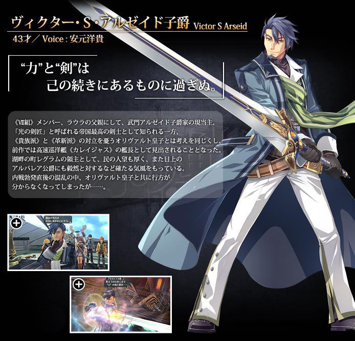 43岁。“Ⅶ班”成员劳拉的父亲,武术名门亚尔赛德流现任当家。以“光之剑匠”的帝国最高剑士称号为众人所知,与此同时作为与烦恼着“贵族派”与“革新派”队里现状的奥利维特皇子抱持同样想法的人,在前作担任了高速巡洋舰“卡雷贾斯”的舰长。作为湖畔城镇雷格拉姆的领主,深受人民爱戴,并拥有着能够毅然面对地位较高的艾尔巴雷亚公爵的品格。在内战爆发之后的混乱中,与奥利维特皇子一同下落不明……