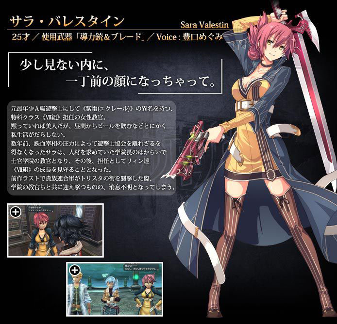 25岁。曾是最年轻的A级游击士,绰号“紫电”,担任特科班“Ⅶ班”班主任的女教官。虽然是个大美人,但经常酗酒,私生活非常糜烂。数年前因铁血宰相的压力不得不离开游击士协会的莎拉,被渴求人才的学院长招募进入军官学院担任教官,随后作为班主任见证“Ⅶ班”成员的成长。前作最后在叛军袭击学校时与学院其他教官一起迎战,混战中下落不明。