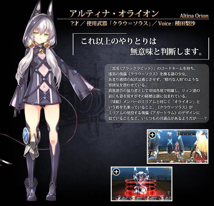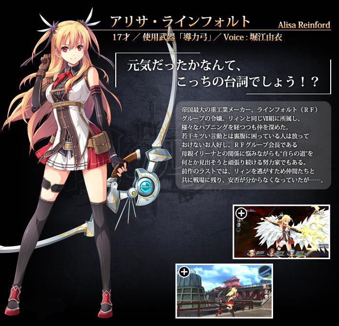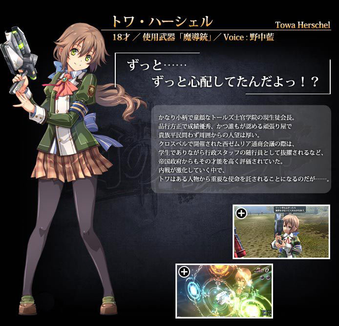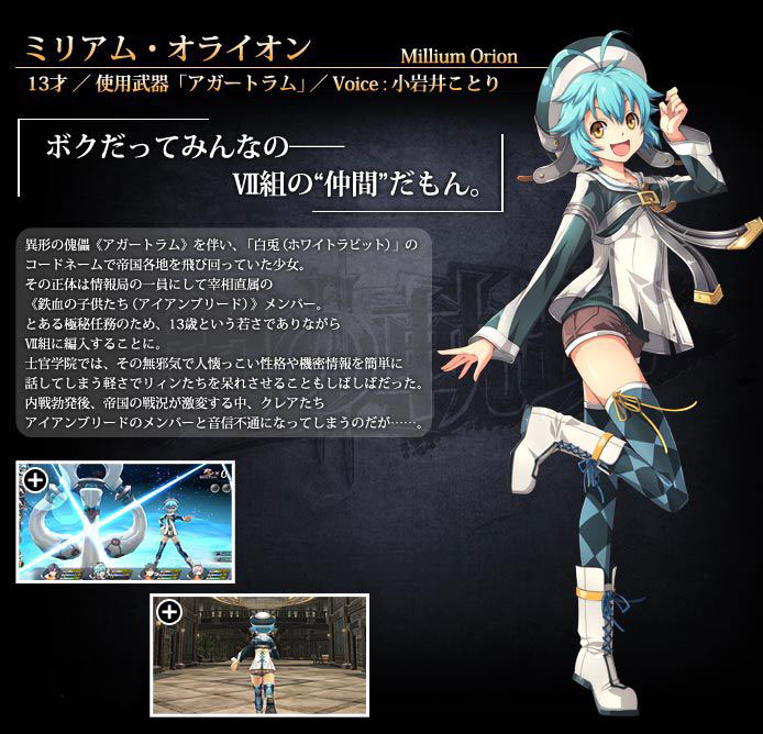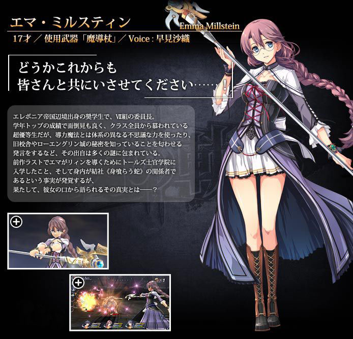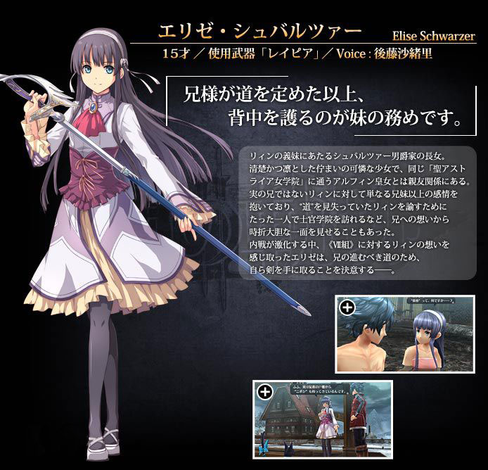 18岁。娇小可人的托尔兹军官学院的娃娃脸学生会长。品行方正成绩优秀,加上众所公认的努力家性格,周围的人们不论平民还是贵族都很尊敬她。在克洛斯贝尔举行西塞姆利亚通商会议时期,以学生身份被提拔为政府随行员,帝国政府对她的才能也有非常高的评价。在不断激化的内战当中,她被某位人物赋予了一项非常重要的使命……