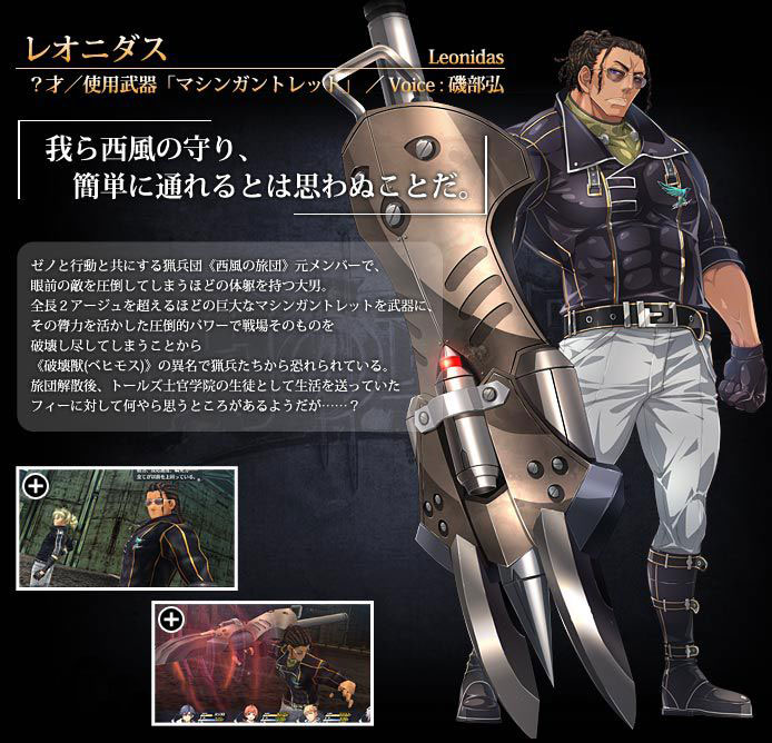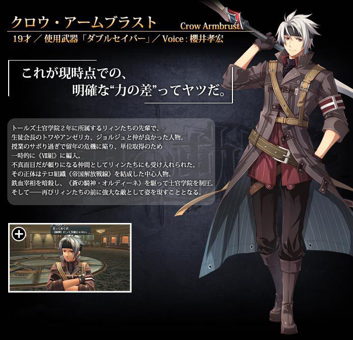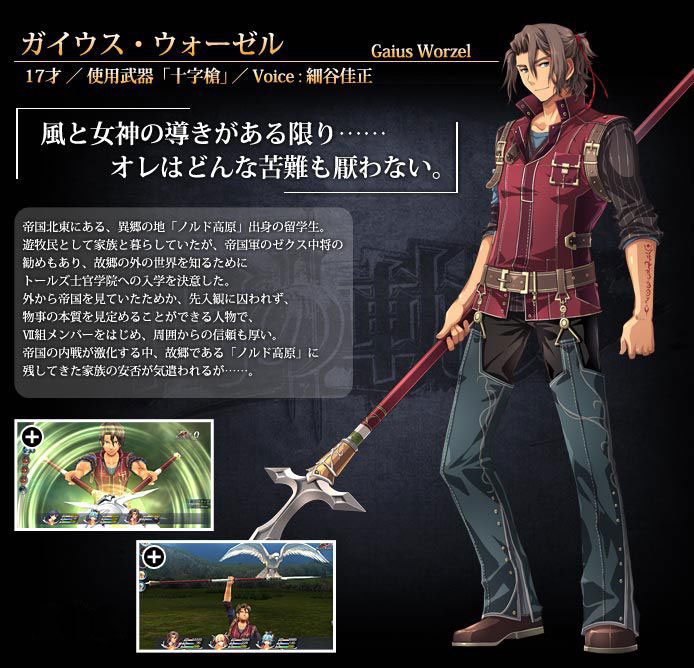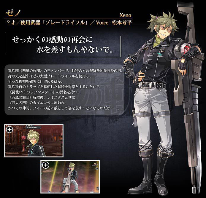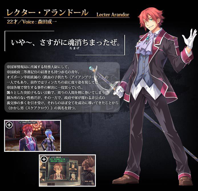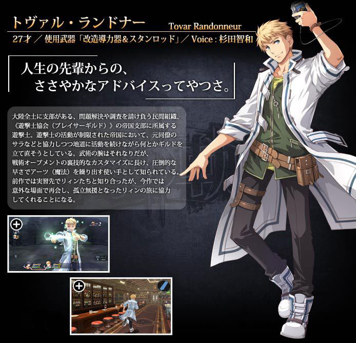 27岁。在大陆全境都存在支部、负责解决问题或调查事件等各种委托的民间组织“游击士协会”帝国支部的游击士。在游击士活动受到限制的帝国之中,他与前同僚莎拉等人仍然继续保持着合作,不断从事着公会的活动。在武术方面他虽然拥有自己的风格,不过他更擅长个性化的战术导力器技术,在使用导力魔法方面有着压倒性的速度。在前作中,他和实习期的黎恩等人打过交道,而本作中他和黎恩在某个意外的场面下重逢了,而他也对当时孤立无援的黎恩提供了帮助。