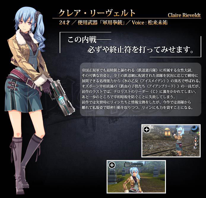 24岁。帝国正规军中被誉为最精锐部队的“铁道宪兵队”的女性上尉。她不仅有着可爱的外貌,还拥有能够根据全境内铁道网络中部队配置来进行部署的处理能力,拥有“冰之少女”的异名。她还是奥斯本宰相直属的“铁血之子”的一员,在前作的最后她试图防止恐怖分子领袖“C”暗杀宰相的行动,不过还是以些微的差距而失败。前作中曾与实习期的黎恩等人交换过情报,而本作中她以便装的姿态进行隐秘行动,并将自己的力量借给了黎恩。