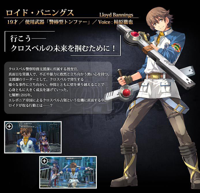 19岁。前作《零之轨迹》与《碧之轨迹》的主角,本作外传主角。克洛斯贝尔警察特别任务支援课的捜査官。为人认真,敢于面对各种不实行为及暴力。作为支援科的队长,面对在克洛斯贝尔发生的各种事件,和同伴们一起跨越难关,身心都有了很大的成长。七耀历1205年。在面对埃雷波尼亚帝国占领克洛斯贝尔的危机之中,罗伊德会采取怎么样的行动呢……?