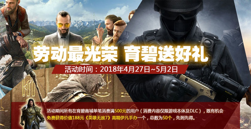 即日起至5月2日,凡在育碧中文商城购买游戏且单笔订单金额满500元(仅限游戏本体及DLC,游戏内道具及点数除外)即有机会获得价值188元的《英雄无敌7》伊凡高精手办一个。