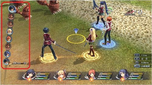 本作依旧传承轨迹的系列的AT(Action Time)系统战斗,在战斗中的左侧为行动順序(下圖所示),伙伴和敌人进行行动。而随着行动会伴随各种随机奖励,如回复HP/MP/CP或者致命一击的特效。不过AT系统奖励是不分敌我随机出现发动的。