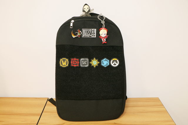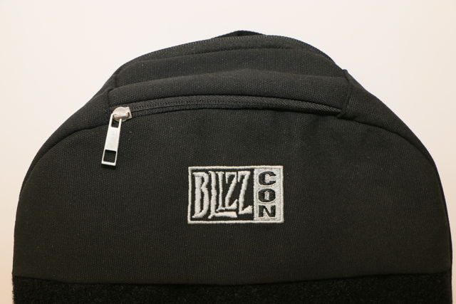 今年的包包是全黑色的后背包,正面仅绣着BlizzCon,背带则是Blizzard 的LOGO,特别的是,正面中间有一大块魔鬼毡设计,让玩家可以自己黏上喜爱的东西。