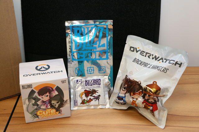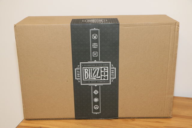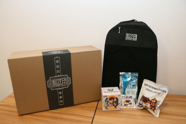 福袋从美国寄送过来,外盒上贴着BlizzCon 2017,并列出Blizzard 旗下游戏LOGO,打开后会看到黑色包包,里头装着其余内容。
