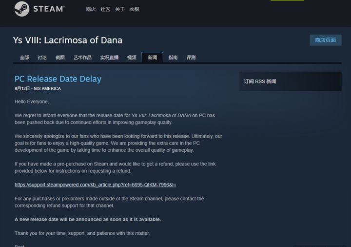 游戏的Steam页面上NIS发布了一则公告,称对这次跳票十分抱歉并表示是为了给玩家们提供更好的游戏品质,同时还表示如果有玩家等不及可以进行退款。新的PC版发售日期将在稍后公布。
