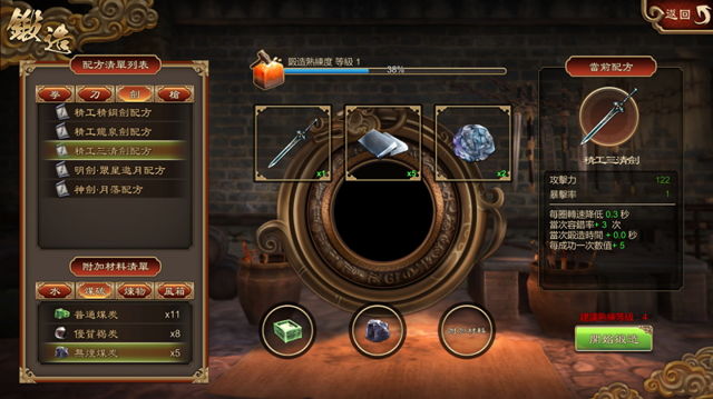 开启「锻造」系统后,玩家放入配方指定材料,此时打铁炉火燃起,挑战者只要随着中央指针的转动敲击捶打,即可获得武器。完美打击将可以提升成品品质,成功次数越多,成品的数值加成越高。此外,玩家在江湖探索中,有机会搜集到各式各样的素材,这些素材都可能成为「锻造」中的附加材料,提升武器品质及成功机率。
