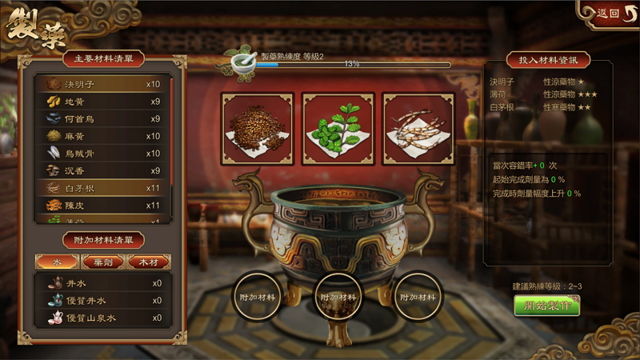 行走江湖难免需要求医问药,此时前往「洛阳」可开启「制药」系统,练丹药时程序很重要,因此这里就考验玩家的记忆力。随机放入药材后,丹炉上方将出现几种显示不同方向的药材图示,停留数秒后,图示会全部转化成问号,玩家只要于指定时间内,依序输入正确图示,就能成功炼制丹药。