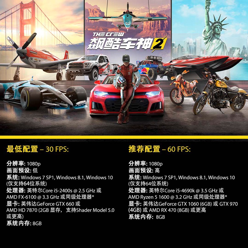 全新开放世界竞速游戏《飙酷车神2(The crew)》将于6月29日正式发售,全球封测活动则将于5月31日至6月4日开启。而今天,游戏研发团队也正式公布了《飙酷车神2》PC版的最低配置及推荐配置要求,具体如下: