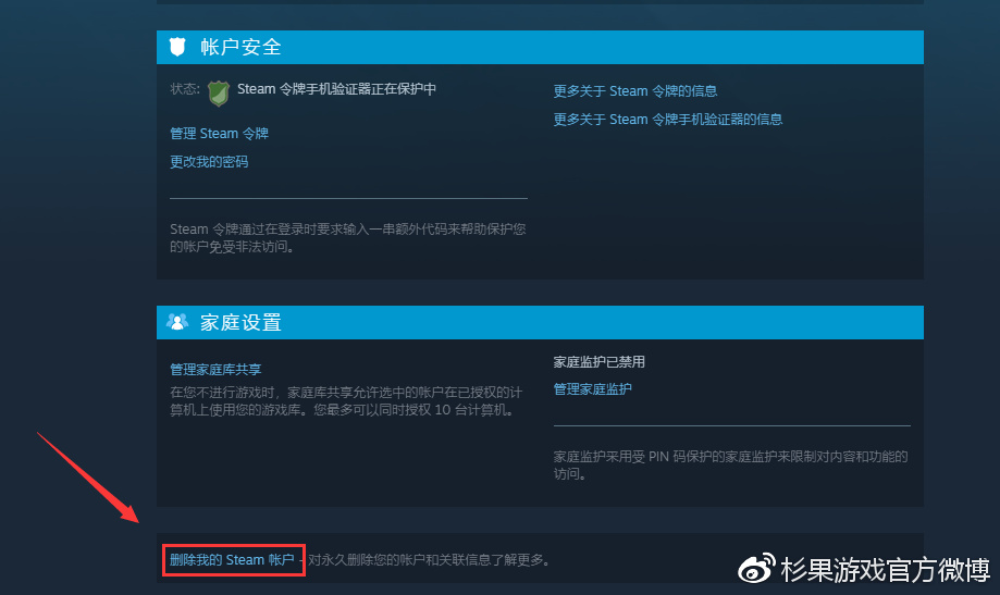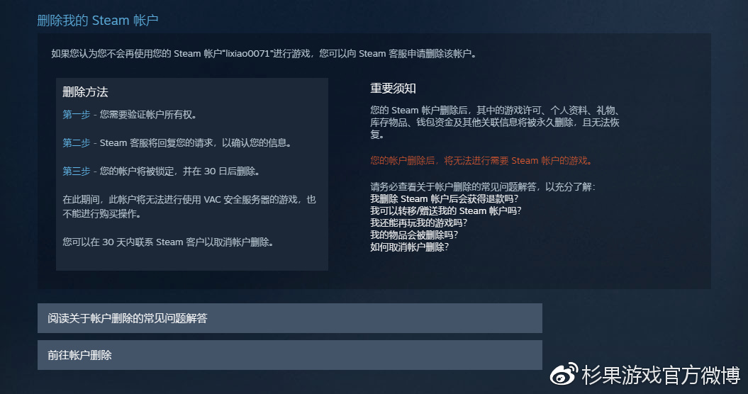 点击“账户明细”最下方的“删除我的Steam账户”,在提交了你的帐户所有权证明后,Steam客服就会收到你的账号删除请求,并在30天后将你的游戏、个人资料、礼物、库存及其他关联信息彻底清空。