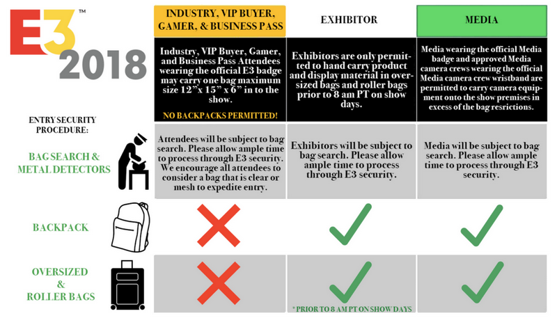 今年的E3展在安保方面显得格外严格。展出举办方在刚公布的2018年安保方针中要求,除了展区工作人员及媒体记者外,只有佩戴E3官方徽章的业内人士、VIP门票观众、游戏主播、商业人士能够携带背包入场。而这些观众的背包尺寸也不能超过12英寸x15英寸x6英寸(约合30厘米x38厘米x15厘米)的限制。
