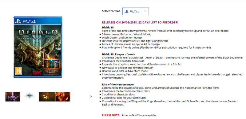 英国一家游戏零售商在昨天泄露了《暗黑破坏神3:永恒典藏版(Diablo III: Eternal Collection)》实体版的发售日期。商店页面上显示本作将在今年6月26日正式发售,登陆PS4以及Xbox One平台,售价为35英镑(约合人民币300元)。与此同时德国亚马逊网站也上架了这款实体版游戏,售价为30欧元(约合人民币300元)。