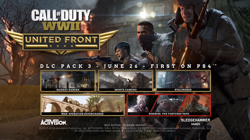 新DLC名为“统一战线(United Front)”,其中包含了几张多人模式地图、纳粹僵尸模式的新内容“折磨之路(The Tortured Path)”以及设定在突尼斯南部沙漠的名为“压制行动(Operation Supercharge)”的大规模战争模式。