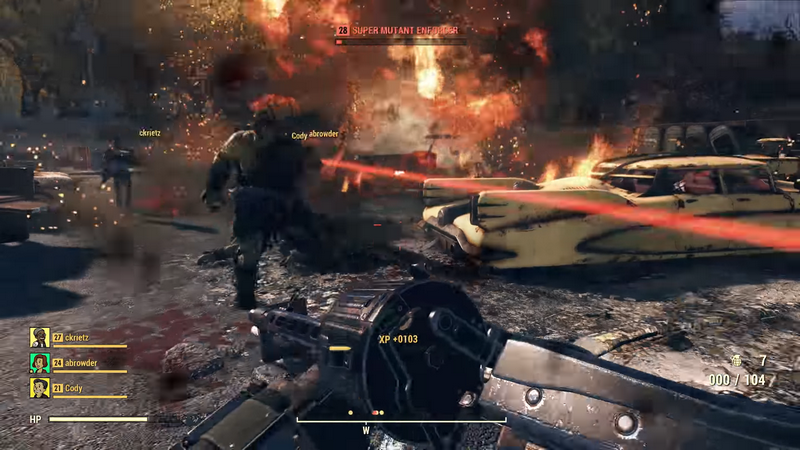 视频中向我们展示了玩家和其他3名队友一起在废土上与其他玩家和突变生物战斗。在本作中,《辐射4(Fallout 4)》中的各种工作台得到了保留,玩家仍可以在废土中拾荒,并制造出各种武器、护甲和药品。而除了许多全新的突变生物以外,本作还新增加了表情系统。