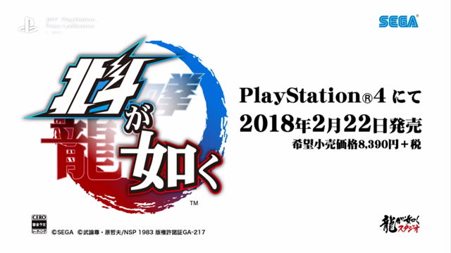 SIE今日在东京举行2017东京电玩展的PlayStation展前发表会,宣布新款动作冒险游戏《人中北斗(北斗が如く)》预定2018年2月22日上市,日元不含税售价8390日圆。