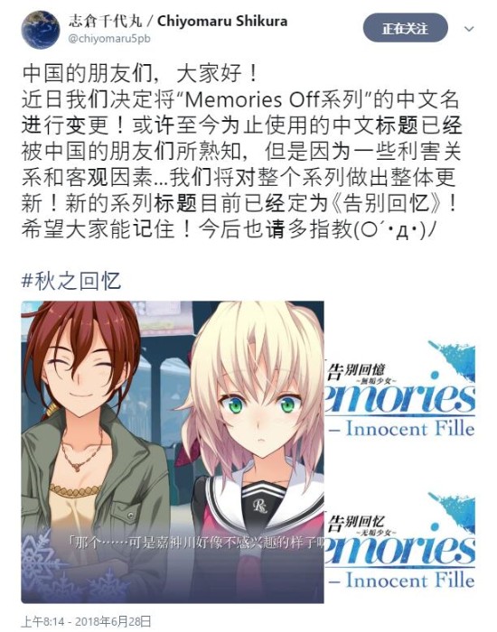 原定6月发售的《秋之回忆》中文版延期,今日官方给出了延期原因。Mages社长志仓千代丸今日在推特上用中文发文,《秋之回忆(Memory Off)》系列的中文名“因为一些利害关系和客观因素”,该系列正式更名为《告别回忆》,整个系列都将做出整体更新。