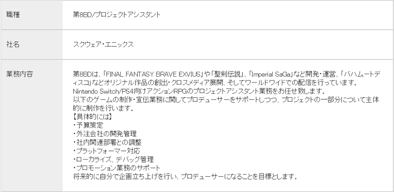 这名项目助理需要支持制作人参与新游戏的推广业务,对于这个新游戏人们却知之甚少,除了游戏类型和登陆平台之外我们一无所知。目前还没有更多关于游戏的信息,很难将此与目前已有的SE游戏联系起来,也很难猜测是否属于新的IP。