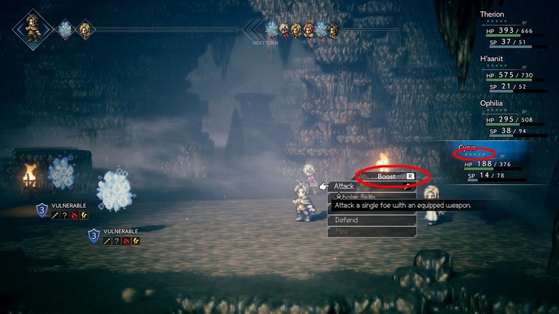 《八方旅人》还借鉴了史克威尔艾尼克斯的另一部作品《勇气默示录(Bravely Default)》中的“Brave”机制,游戏中名为“Boost”的机制可以让角色在一回合内攻击数次,你也可以把这一效果留到之后的回合中使用。但与《勇气默示录》不同的是,你可以选择让角色进行普通攻击或是Boost攻击,而不是必须什么都不做才能保留这一效果。