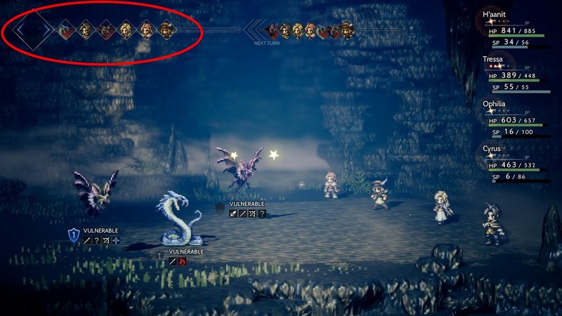 每回合,玩家和敌人的每名角色都会进行一次攻击,攻击的先后顺序显示在屏幕左上角,在它的右边显示了下一回合的攻击顺序。每位角色的伤害类型因其所携带的武器,使用的魔法不同而有所变化。此外游戏中每个敌人的血量的都是隐藏的,在它们的生命值降到0之后就会从战场上消失。