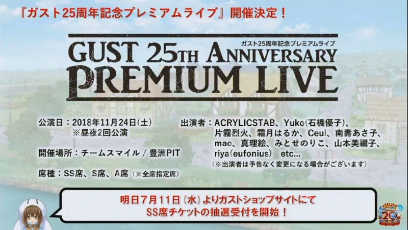 GUST宣布,他们将会在今年11月24日举行“GUST工作室25周年纪念音乐会。届时片雾烈火、Ceui、南寿あさ子等人气歌手都会到场参与演出。